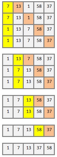 ( پس بخش مرتب شامل اعدا 13و7 است و بخش نامرتب شامل اعداد 37و58و1.)