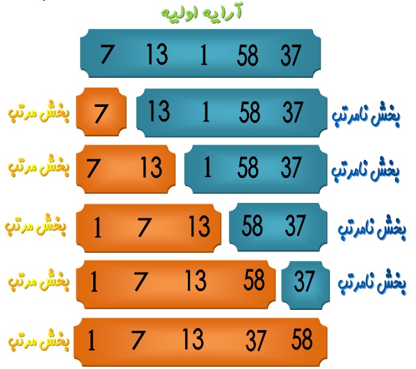 توضیحات: در ابتدا بخش مرتب شامل عدد 7 است و بخش نامرتب شامل اعداد 37و58و1و13.