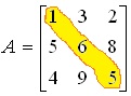 هر ماتریس مربعی یک قطر اصلی دارد، که برابر است با عناصری که شماره سطر و ستون آن یکی است: در ماتریس A عناصر تشکیل دهنده قطر برابر 1و 6و 5 هستند.